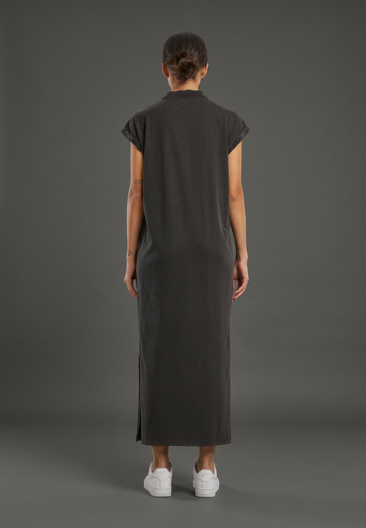 - Dámske dlhé tričkové šaty so stredne voľným strihom a moderným stand-up golierom.